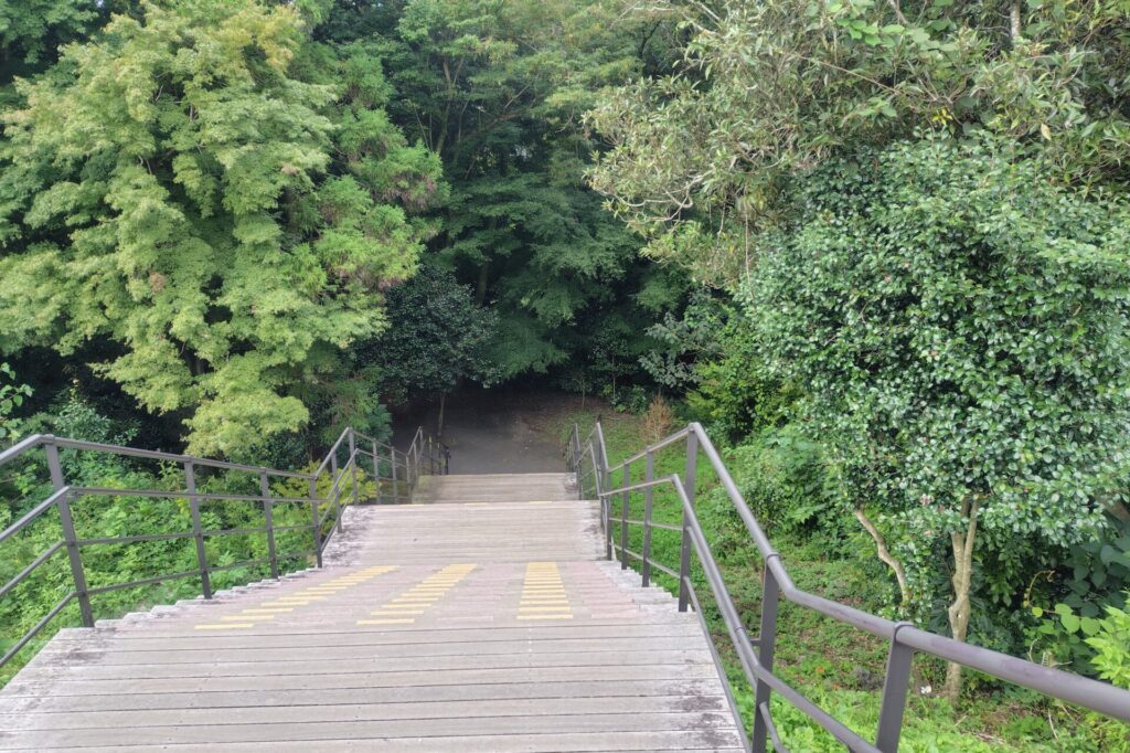 写真は最初の階段ですが、もう少し左手にはスロープでも行くことができるので、そちらを利用した方が楽ですよ。