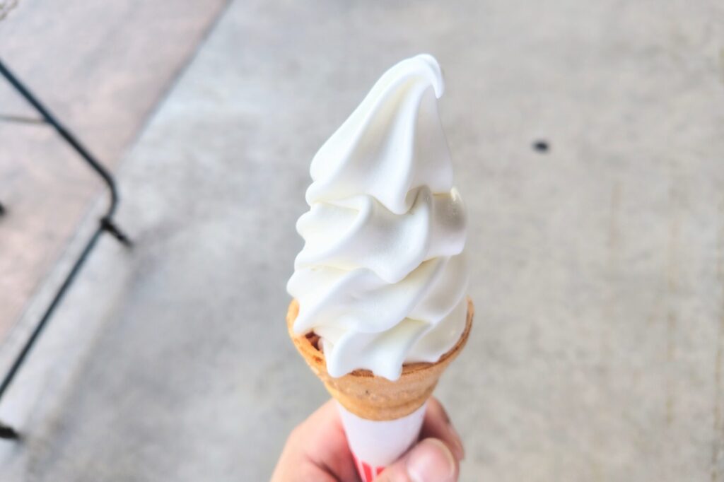 ここでは近くにある【まかいの牧場】から、朝に搾った牛乳を使って、ソフトクリームを販売しています。